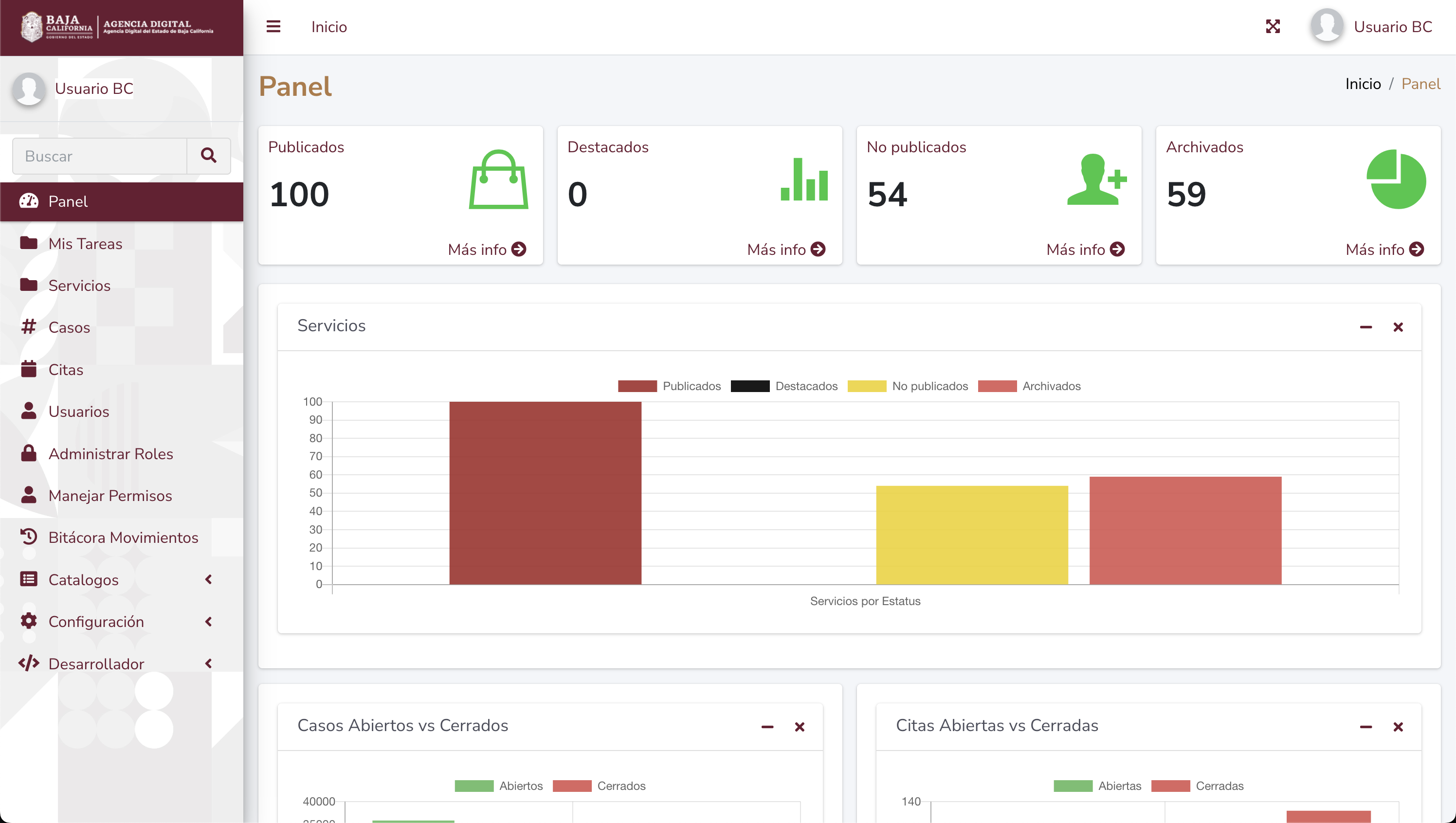 Baja a Media. La interfaz está diseñada para ser intuitiva. Para los funcionarios, la plataforma ofrece un tour guiado y una estructura lógica basada en menús (Panel, Tareas, Casos), lo que facilita su adopción sin requerir conocimientos técnicos avanzados.