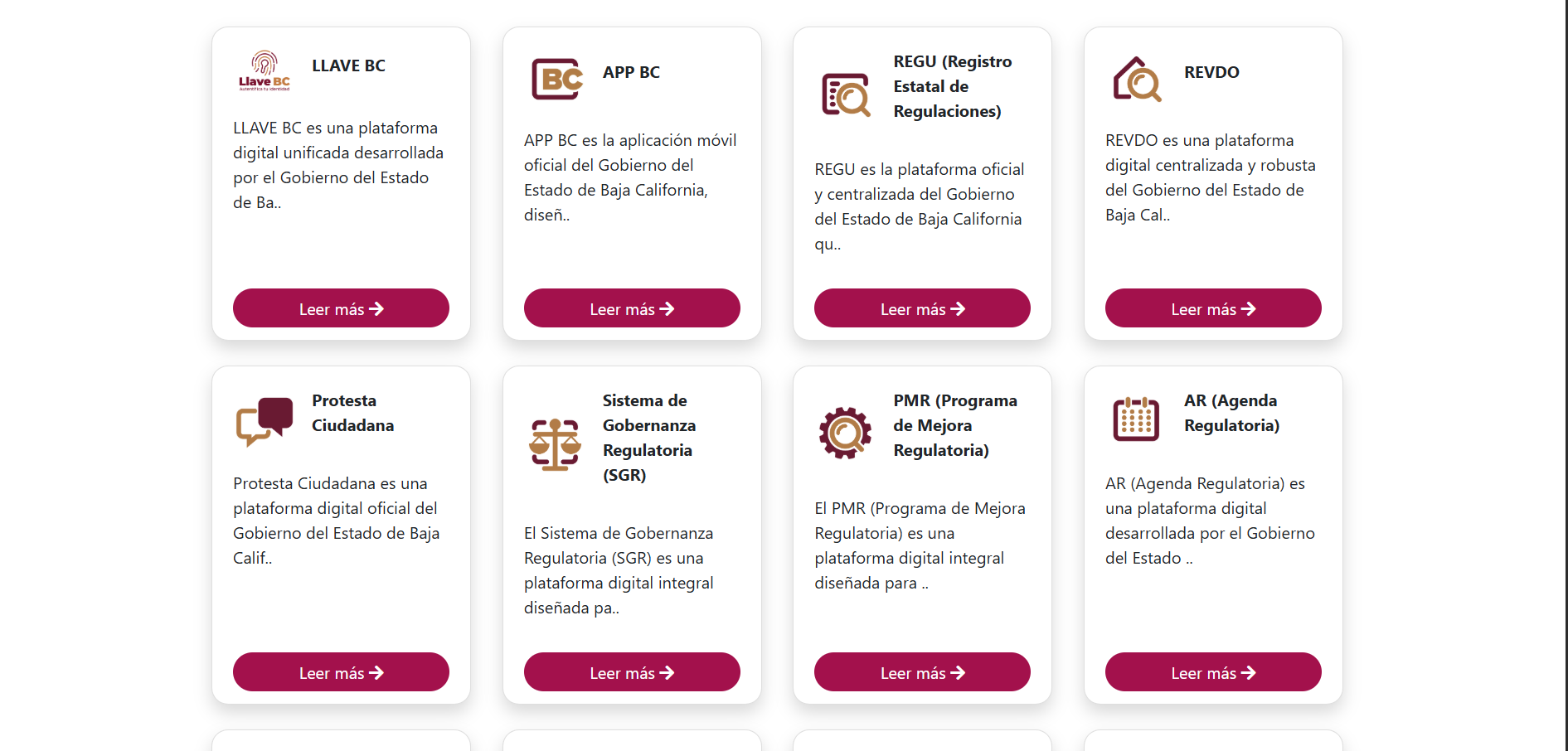 Acceso a Servicios Digitales: Actúa como un directorio y punto de enlace a las principales herramientas y plataformas digitales del gobierno de Baja California (ej. enlace a LLAVE BC, servicios en línea).